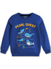 This vibrant blue boys sweatshirts features a playful ocean theme with sharks, dolphins, and sea creatures on a treasure map design. Cozy and durable, perfect for active kids who love adventure and fun.