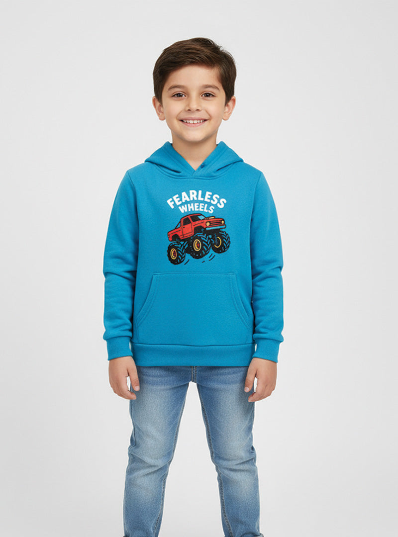 Awesome turquoise hoodie for boys featuring 'Fearless Wheels' design with bold red monster truck graphic. Soft fleece pullover with hood, drawstrings, and front kangaroo pocket. Warm and comfortable material perfect for winter. Your little adventurer will love this exciting and cozy hoodie. Perfect for truck-loving kids