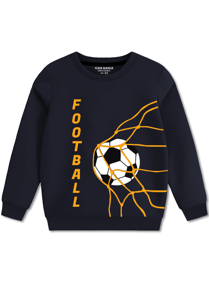This navy kids' sweatshirt features a bold football and basketball graphic with a dynamic net design, perfect for young sports enthusiasts. Comfortable, stylish, and ideal for active play and casual wear.