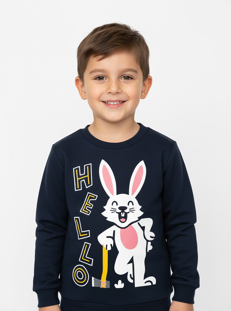 Hello Rabbit Printed Boys Sweatshirt – soft fleece comfort meets charming rabbit graphics. Ideal for layering through winter months.