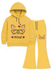 Adorable yellow tracksuit set for girls featuring cute cat face with glasses and 'Meow' text surrounded by hearts. Includes soft fleece hoodie with hood, drawstrings, and front pocket, plus matching flare pants with cat graphic on leg. Warm and comfortable material perfect for winter. Your little cat lover will adore this sweet and playful outfit! Perfect for girls who love cats and fun fashion