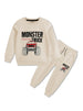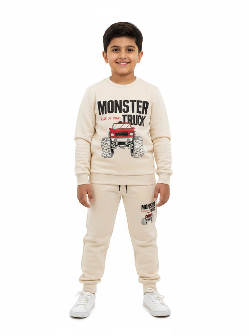 Bold monster truck design meets premium comfort in this fleece tracksuit for boys. Durable, soft fabric withstands active play while keeping him warm. A go-to choice for kids who love adventure and style.